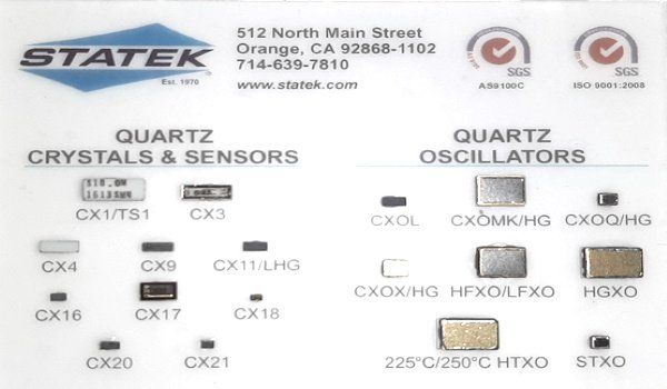 Statek, a company included in the TCI IIgroup, is a company leader in the design and manufacture of ultra-miniature quartz crystals oscillators and sensors for the Defense, Aerospacial, Industrial and Medical markets. Typical features of Statek crystals oscillators and sensors are: high stability and precision frequency, low longterm aging, low power consumption, extremely small footprint and excellent shock resistance and Ultra lowprofile.